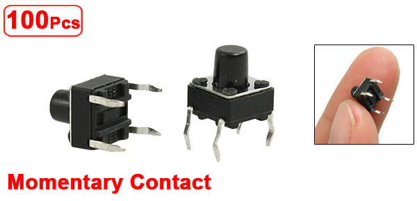 Product Name Tact Switch Quantity 100±2% Pcs Contact Type Momentary Contact Dimension 6 x 6 x 7mm / 0.24" x 0.24" x 0.28" (L*W*H) Button Dia. 3mm/ 0.12" Pin Pitch 5 x 6mm / 0.2" x 0.24" (L*W) Pin Length 5mm / 0.2" Material Plastic, Metal, Electric Parts Color Black, Silver Tone Net Weight 30g