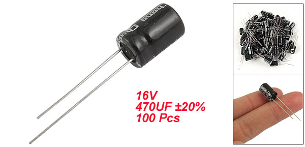 Product Name Aluminum Electrolytic Capacitor Type Radial Lead Maximum Temperature 105°C Voltage 16V Capacitance 470uF Capacitance Tolerance ±20% Body Size 8 x 12mm/0.3'' x 0.47'' (D*L) Lead Spacing 3mm/0.12'' Lead Length 26mm/1'', 21mm/0.83'' External Material Aluminum Weight 98g Color As Picture Shown Package Content 100 Pcs (±2%) x Electrolytic Capacitors - Reviews