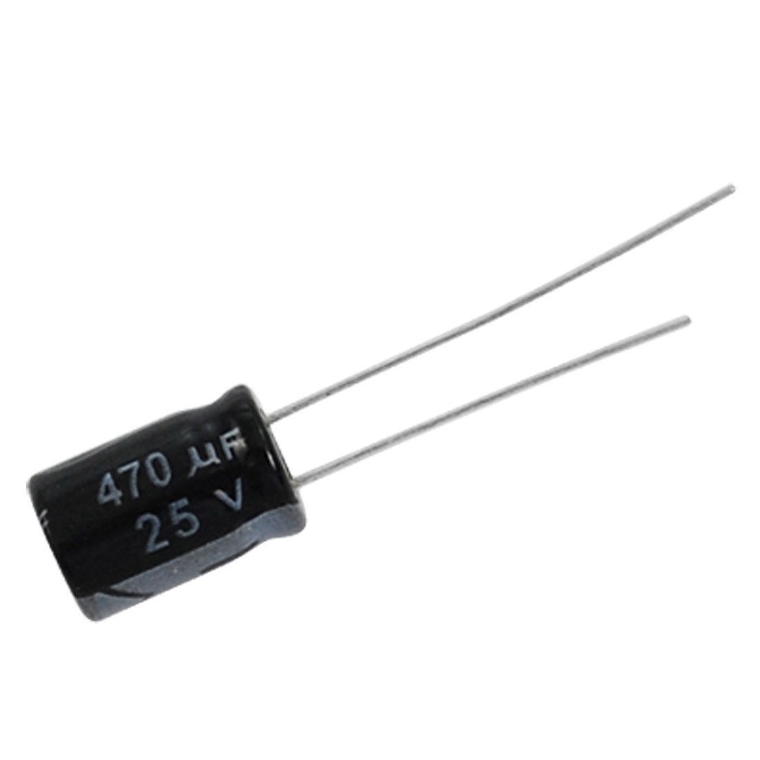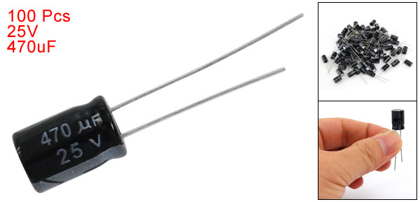 Product Name Aluminum Electrolytic Capacitor Type Radial Lead Maximum Temperature 105°C Voltage 25V Capacitance 470uF Capacitance Tolerance ±20% Size 8 x 12mm / 0.31" x 0.47" (D*L) Lead Spacing 4mm Lead Length 21mm, 27mm External Material Aluminum Weight 108g Color As Picture Shown Package Content 100 Pcs (±2%) x Electrolytic Capacitors  - Reviews