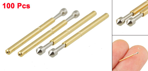 Product Name Test Probe Model No. 975E Quantity 100 ± 2% Pcs Tip Type 90 Degree Convex Tip Dia(Approx) 1..3mm/ 0.051" Barrel Size(Approx) 1 x 13mm/ 0.039" x 0.51"(D*L) Overall Length(Approx) 17mm/ 0.67" Material Metal Color Gold Tone, Silver Tone Net Weigth 8g Package Content 100 Pcs x Test Probe - Reviews
