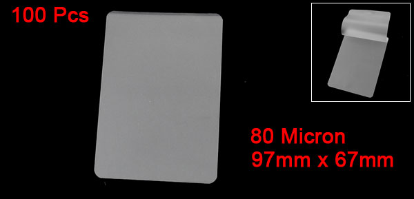 Product Name Laminating Film Material Soft Plastic Color Clear White Fit Temperature 110°C-130°C Each One Thickness 80 Micron Each One Size 97x 67mm/3.8' x 2.6'' (L*W) Weight 129g Package Content 100 x Laminating Film - Reviews