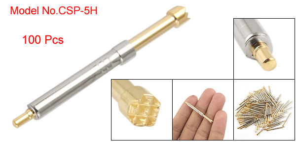 Product Name Test Probe Model No. CSP-5H Material Metal Quantity 100 Pcs (± 2%) Tip Type Serrated Tip Dia 3.4mm/0.13" Other End Dia 1.5mm/0.06" Barrel Size 3.1 x 21mm/0.12" x 0.8"(D*L) Overall Length(Each) 37mm/1.45" Color Silver Tone, Gold Tone Net Weigth 177g Package Content 100 Pcs x Test Probe Pin - Reviews