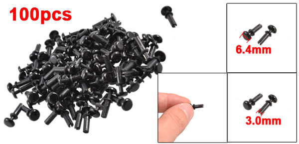 Product Name Push Rivet Part No. R3090 Head Dia.(Approx.) 6.4mm/ 0.25" Head Thickness(Approx.) 1.6mm/ 0.063" Bottom Dia.(Approx.) 3.0mm/ 0.118" Push In Height(Approx.) 9.0mm/ 0.35" Total Height(Approx,) 15mm/ 0.59" Fit for Panel Thickness 6.5-7.5mm Material Nylon Color Black Net Weight 14g Package Content 100±2% Pcs x Push Rivet - Reviews