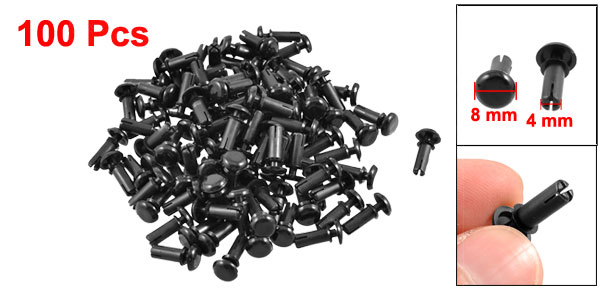 Product Name Push Rivet Part No. R4100 Head Dia.(Approx.) 8.0mm/ 0.31" Head Thickness(Approx.) 1.8mm/ 0.071" Bottom Dia.(Approx.) 4.0mm/ 0.157" Push in Height(Approx.) 10.0mm/ 0.39" Total Height(Approx,) 14.5mm/ 0.57" Fit for Panel Thickness 7.5-8.5mm Material Nylon Color Black Net Weight 22g Package Content 100±2% Pcs x Push Rivet - Reviews