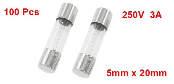 Details100 Pcs Fast Blow Cylinder Shape 5mm x 20mm Glass Tube Fuses 250V 3A Amp  Product Name Glass Tube Fuses Fuction Fast Blow Rated Voltage 250V Rated Current 3A Specification 5 x 20mm Diameter 5mm / 0.197" Length 20mm / 0.787" Material Glass, Metal Color Clear, Silver Tone Weight 59g Package 100(+/-2%) x Glass Tube Fuses