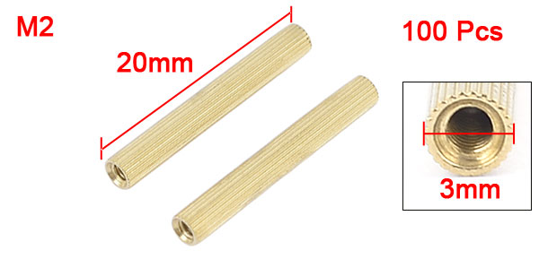 Product Name Brass Standoff Spacer Thread Size M2 Female Total Size(Approx.) 20 x 3mm/ 0.78" x 0.12" (L*Max.D) Material Brass Color Gold Tone Net Weight 88g Package Content 100(±2%) x Brass Standoff Spacer - Reviews