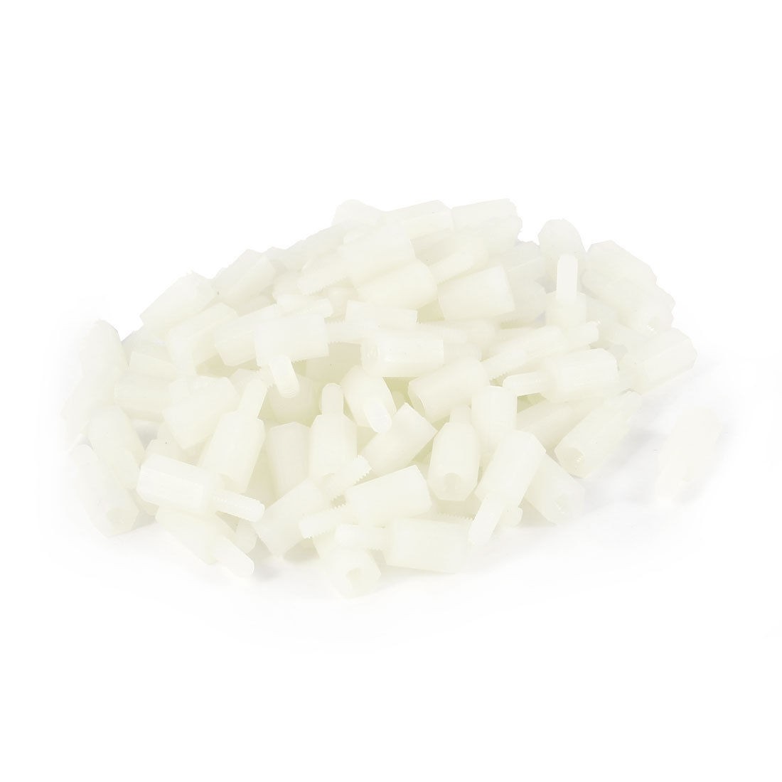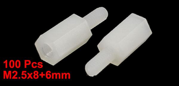 Details100 Pcs M2.5 x 8mm + 6mm Hex Hexagonal Threaded Spacer Support  Product Name Nylon Standoff Spacer Material Nylon Thread Size M2.5 / 2.5mm Length 8mm Female + 6mm Male Color Off White Weight 26g Package Content 100(±2%) x Nylon Standoff Spacer