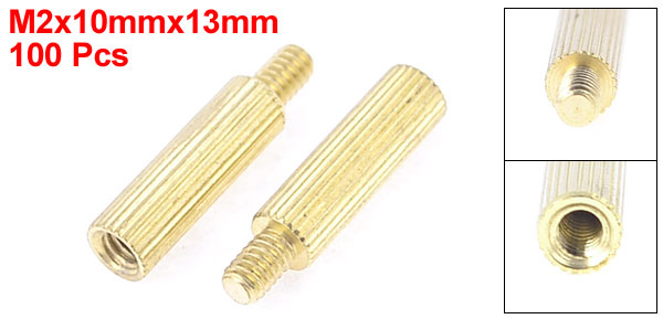 Product Name Brass Pillars Standoff Thread Size M2 Male x M2 Female Male Thread Length 3mm/ 0.12" Body Length 10mm/ 0.39" Total Size(Approx.) 13 x 3mm/ 0.51" x 0.12" (L*Max.D) Material Brass Color Gold Tone Net Weight 50g Package Content 100(±2%) x Brass Pillars Standoff - Reviews