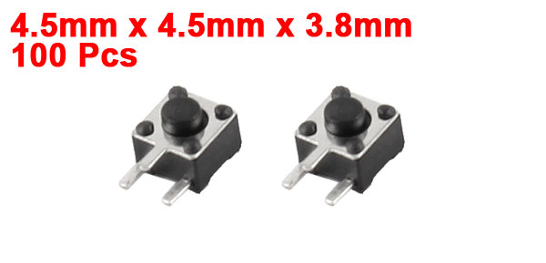 Product Name Tact Switch Type SPST Action Type Momentary Dimension 4.5 x 4.5 x 3.8mm / 0.18" x 0.18" x 0.15"(L*W*H) Button Dia 2mm / 0.08" Pin Length 1.5mm/0.06" Material Plastic, Metal, Electric Parts Color Black, Silver Tone Net Weight 13g Package Content 100(±2%) x Tact Switch - Reviews
