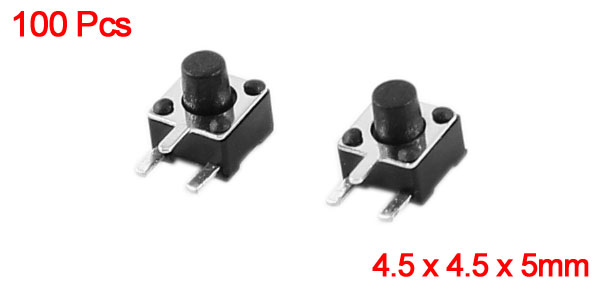 Product Name Tact Switch Type SPST Action Type Momentary Dimension 4.5 x 4.5 x 5mm / 0.18" x 0.18" x 0.2"(L*W*H) Button Dia 2mm / 0.08" Pin Length 1.5mm/0.06" Material Plastic, Metal, Electric Parts Color Black, Silver Tone Net Weight 13g Package Content 100(±2%) x Tact Switch - Reviews