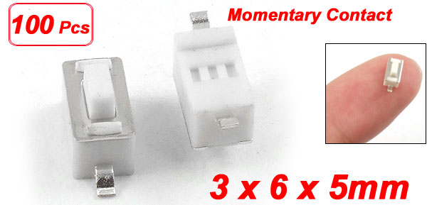 Product Name Tact Switch ActionType Momentary Mounting Type SMD Quantity 100 Pcs ±2% Size 3 x 6 x 5mm / 0.11" x 0.23" x 0.19" (W*L*H) Button Size 3 x 1.8 x 2mm/ 0.11" x 0.07" x 0.07"(L*W*H) Pin Spacing 8mm / 0.314" Pin Size 1 x 1mm/ 0.03" x 0.03"(L*W) Material Plastic, Metal, Electric Parts Color White, Silver Tone Net Weight 18g Package Content 100 Pcs ±2% x Tact Switches - Reviews