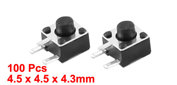 Product Name Tact Switch Type SPST Action Type Momentary Dimension 4.5 x 4.5 x 4.3mm / 0.18" x 0.18" x 0.17"(L*W*H) Button Dia 2mm / 0.08" Pin Length 1.5mm/0.06" Pin Spacing 3 x 2.5mm/0.12" x 0.1"(L*W) Material Plastic, Metal, Electric Parts Color Black, Silver Tone Net Weight 13g Package Content 100(±2%) x Tact Switch - Reviews