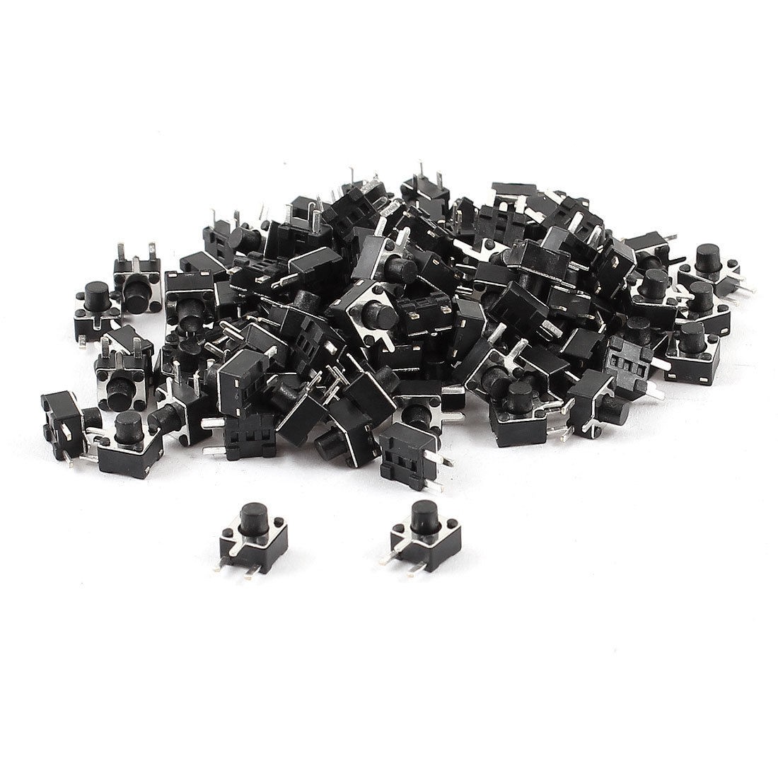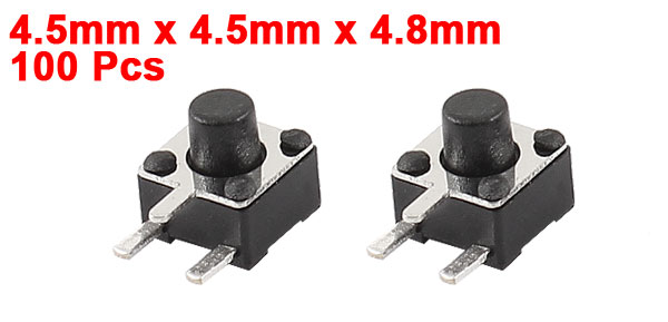 Details100 Pcs PCB Mounted Momentary 3-pin Tact Pushbutton Switch 4.5mmx4.5mmx4.8mm  Product Name Tact Switch Type SPST Action Type Momentary Dimension 4.5 x 4.5 x 4.8mm / 0.18" x 0.18" x 0.19"(L*W*H) Button Dia 2mm / 0.08" Pin Length 1.5mm/0.06" Pin Spacing 3 x 2.5mm/0.12" x 0.1"(L*W) Material Plastic, Metal, Electric Parts Color Black, Silver Tone Net Weight 14g Package Content 100(±2%) x Tact Switch