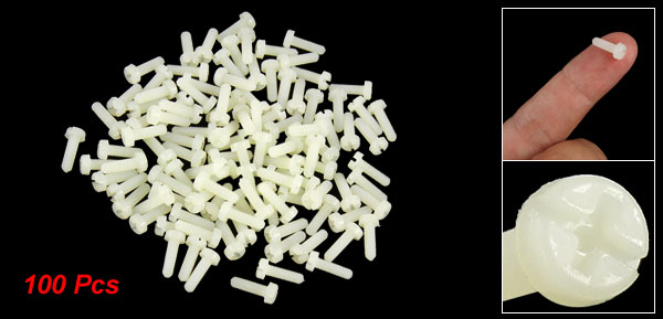 Product Name Screw Tpye Round Cross Head Quantity 100±2% Pcs Thread Length 10mm/ 0.31" Thread Dia. 3mm / 0.12" Overall Size 12 x 5mm/ 0.47" x 0.2" (L*D) Material Plastic Color Off-white Net Weight 11g Package Content 100 x Cross Head Screw - Reviews