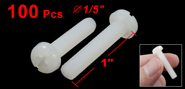 Product Name Screw Type Round Phillips Head Quantity 100±2% Pcs Thread Length 25mm/ 1" Thread Diameter 5mm / 1/5" Overall Size 28 x 9mm/ 1.1" x 0.35" (L*D) Material Plastic Color Off White Net Weight 65g Package Content 100 x Cross Head Screw - Reviews