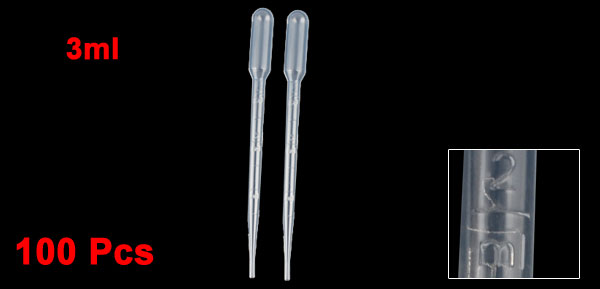 Product Name Pipette Material Plastic Color Clear White Capacity 3ML Total Size(Each) 15 x 1.2cm/ 6" x 0.4" (L*Max.D) Net Weight 113g Package Content