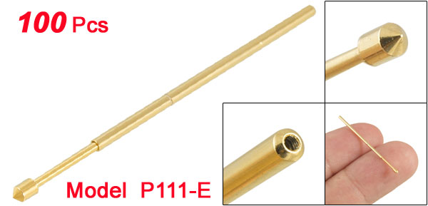 Product Name Spring Probes Quantity 100±2% Pcs Model P111-E Material Metal Tip Diameter (Approx) 1.3mm/ 0.051" Barrel Diameter (Approx.) 1.02mm/ 0.04" Overall Length(Each) 33.30mm / 1.31" Color Gold Tone Net Weigth 15g Package Content 100 x Spring Probes - Reviews