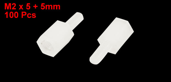 Details100 Pcs White Nylon Hex Standoff Spacer Female to Male M2x5+5mm  Product Name Nylon Standoff Spacer Material Nylon Thread Size M2/ 2mm Length 5mm Female + 5mm Male Color White Weight 12g Package Content 100(±2%) x Nylon Standoff Spacer