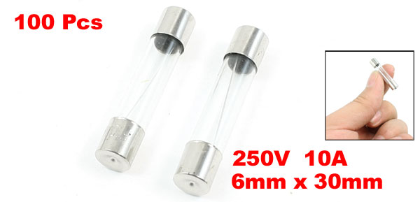 Product Name Glass Tube Fuses Features Fast Blow Rated Voltage 250V Rated Current 10A Dimension 6 x 30mm/ 0.24" x 1.18" (D*L) Material Glass Color Silver Tone, Clear Weight 120g Package 100(+/-2%) x Glass Tube Fuses - Reviews