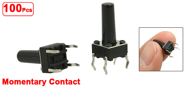 Product Name Tact Switch Quantity 100±2% Pcs Contact Type Momentary Contact Dimension 6 x 6 x 13mm / 0.24" x 0.24" x 0.51" (L*W*H) Button Dia. 3mm/ 0.12" Pin Pitch 5 x 6mm / 0.2" x 0.24" (L*W) Pin Length 5mm / 0.2" Material Plastic, Metal, Electric Parts Color Black, Silver Tone Net Weight 36g Package Content 100 x Tact Switches - Reviews