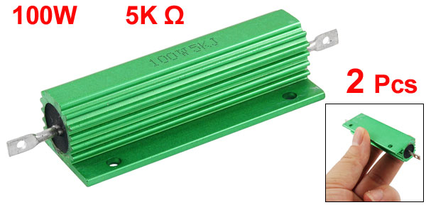 Product Name Aluminum Housed Resistor Resistance Value 5K Ω Power Rating 100W Resistance Tolerance ± 5% (J) Body Size 59 x 15mm/ 2.32" x 0.59" (L*D) Mounted Hole Size 1.8mm/ 0.07", 3mm/ 0.12" Total Size 81 x 21 x 15mm/ 3.2" x 0.83" x 0.59" (L*W*T) Casing Material Aluminum Color Green Weight 60g Package Content 2 x Aluminum Housed Resistor - Reviews