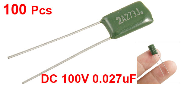 Product Name Polyester Film Capacitors Quantity 100 pieces (±2% ) Model 2A273J Withstand Voltage DC 100V Capacitance 0.027uF Capacitance Tolerance ±5% Body Size 11 x 6 x 3mm/ 0.43" x 0.24" x 0.12" (L*W*T) Lead Spacing 5mm / 0.2" Lead Diameter 0.4mm / 0.016" Weight 37g Main Color Green Package Content 100 x Polyester Film Capacitors - Reviews