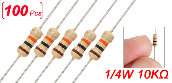 Product Name Resistor Resistor Type Carbon Film Rated Power 1/4 W Resistance Value 10KΩ Tolerance ± 5% Withstang Voltage 250V Body Size (Approx.) 5 x 2mm/0.2'' x 0.08'' (L*D) Lead Size (Each End) 20 x 0.4mm / 0.8" x 0.016" (L*D) Total Length 45mm /1.8'' Color As Picture Shown Weight 10g Package Content 100(±2%) x Carbon Film Resistors - Reviews