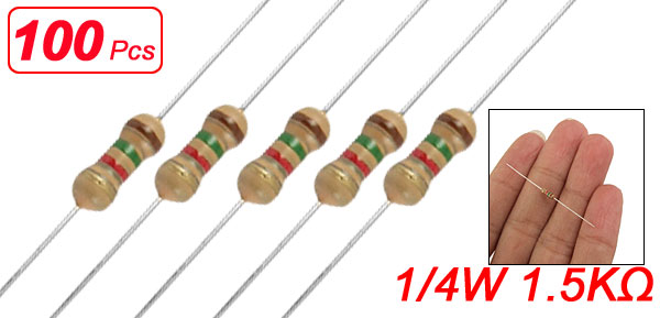 Product Name Resistor Resistor Type Carbon Film Rated Power 1/4 W Resistance Value 1.5KΩ Tolerance ± 5% Withstang Voltage 250V Body Size (Approx.) 5 x 2mm/0.2'' x 0.08'' (L*D) Lead Diameter 0.3mm /0.01 Total Length 45mm /1.8'' Color As Picture Shown Weight 10g Package Content 100(±2%) x Carbon Film Resistors  - Reviews