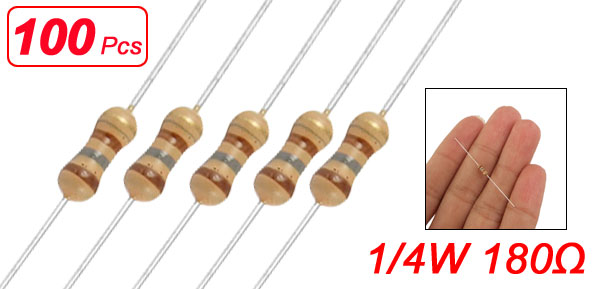 Product Name Resistor Resistor Type Carbon Film Rated Power 1/4 W Resistance Value 180Ω Tolerance ± 5% Withstang Voltage 250V Body Size (Approx.) 5 x 2mm/0.2'' x 0.08'' (L*D) Lead Diameter 0.3mm /0.01 Total Length 45mm /1.8'' Color As Picture Shown Weight 10g Package Content 100(±2%) x Carbon Film Resistors - Reviews