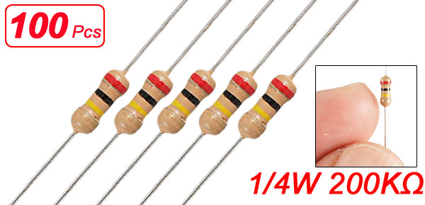 Product Name Resistor Resistor Type Carbon Film Rated Power 1/4 W Resistance Value 200KΩ Tolerance ± 5% Withstang Voltage 250V Body Size (Approx.) 5 x 2mm/0.2'' x 0.08'' (L*D) Lead Size (Each End) 20 x 0.4mm / 0.8" x 0.016" (L*D) Total Length 45mm/1.8'' Color As Picture Shown Weight 10g Package Content 100(±2%) x Carbon Film Resistors - Reviews