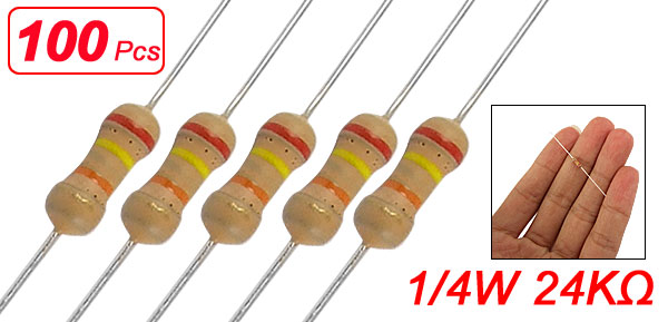Product Name Resistor Resistor Type Carbon Film Rated Power 1/4 W Resistance Value 24KΩ Tolerance ± 5% Withstang Voltage 250V Body Size (Approx.) 5 x 2mm/0.2'' x 0.08'' (L*D) Lead Diameter 0.3mm /0.01 Total Length 45mm /1.8'' Color As Picture Shown Weight 10g Package Content 100(±2%) x Carbon Film Resistors - Reviews