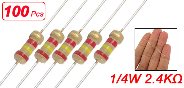 Product Name Resistor Resistor Type Carbon Film Rated Power 1/4 W Resistance Value 2.4KΩ Tolerance ± 5% Withstang Voltage 250V Body Size (Approx.) 5 x 2mm/0.2'' x 0.08'' (L*D) Lead Diameter 0.3mm /0.01 Total Length 45mm /1.8'' Color As Picture Shown Weight 10g Package Content 100(±2%) x Carbon Film Resistors  - Reviews