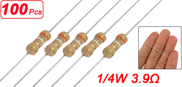 Product Name Resistor Resistor Type Carbon Film Rated Power 1/4 W Resistance Value 3.9 Ω Tolerance ± 5% Withstang Voltage 250V Body Size (Approx.) 5 x 2mm/0.2'' x 0.08'' (L*D) Lead Diameter 0.3mm /0.01 Total Length 45mm /1.8'' Color As Picture Shown Weight 10g Package Content 100(±2%) x Carbon Film Resistors  - Reviews