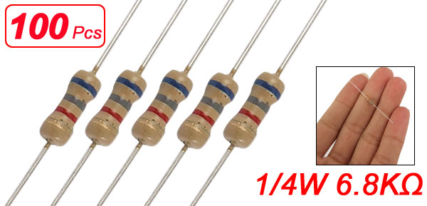Product Name Resistor Resistor Type Carbon Film Rated Power 1/4 W Resistance Value 6.8KΩ Tolerance ± 5% Withstang Voltage 250V Body Size (Approx.) 5 x 2mm/0.2'' x 0.08'' (L*D) Lead Diameter 0.3mm/0.01 Total Length 45mm /1.8'' Color As Picture Shown Weight 10g Package Content 100(±2%) x Carbon Film Resistors - Reviews
