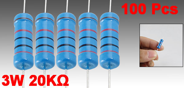 Product Name Metal Film Resistor Quantity 100±2% Pcs Rated Power 3W Tolerance ± 1% Resistance Value 20KΩ T.C.R(Temperature Coefficient) ±50 PPM/°C Body Size 6 x 17mm/0.2'' x 0.7''(D*L) Leads Dia (Approx.) 0.5mm/ 0.02" Total Length (Approx.) 80mm/3.1'' Main Color Blue Net Weight 144g Package Content 100(±2%) Pcs x Metal Film Resistors - Reviews