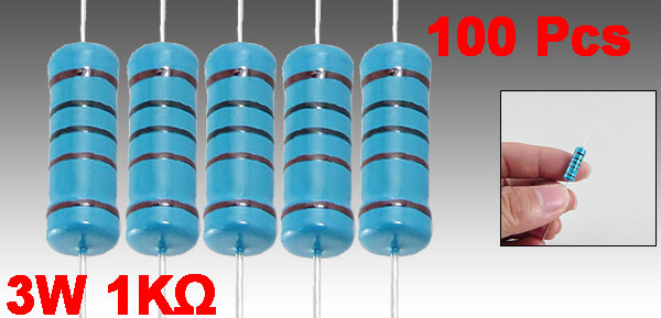Product Name Metal Film Resistor Quantity 100±2% Pcs Rated Power 3W Tolerance ± 1% Resistance Value 1KΩ T.C.R(Temperature Coefficient) ±50 PPM/°C Body Size 6 x 17mm/0.2'' x 0.7''(D*L) Leads Dia (Approx.) 0.5mm/ 0.02" Total Length (Approx.) 80mm/3.1'' Main Color Blue Net Weight 144g Package Content 100(±2%) Pcs x Metal Film Resistors - Reviews