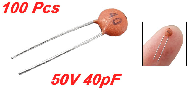 Product Name Ceramic Disc Capacitor Features Low Voltage Withstand Voltage DC 50V Capacitance 40pF Capacitance Tolerance ± 10% Lead Pitch Spacing 2mm/0.08'' Body Dimension(Each) 3 x 1.5mm / 0.1" x 0.05"(D*T) Weight 6g Color Brick Red Package Content 100 (± 2%) x Ceramic Disc Capacitors - Reviews