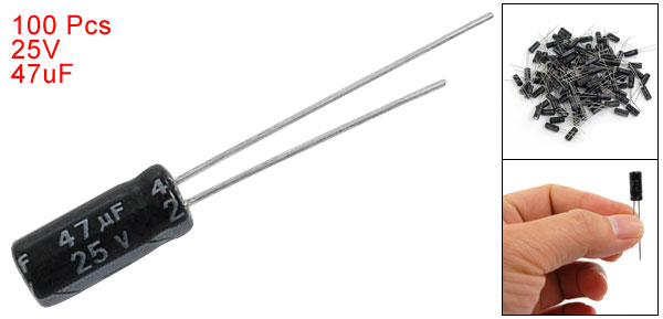 Product Name Aluminum Electrolytic Capacitor Type Radial Lead Maximum Temperature 105°C Voltage 25V Capacitance 47uF Capacitance Tolerance ±20% Size 5 x 11mm / 0.2" x 0.43" (D*L) Lead Spacing 2mm Lead Length 19mm, 24mm External Material Aluminum Weight 40g Color As Picture Shown Package Content 100 Pcs (±2%) x Electrolytic Capacitors - Reviews