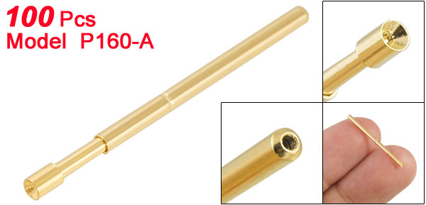 Product Name Spring Probes Quantity 100±2% Pcs Model P160-A Material Metal Tip Diameter (Approx) 1.5mm/ 0.059" Barrel Diameter (Approx.) 1.36mm/ 0.054" Overall Length(Each) 24.5mm / 0.96" Color Gold Tone Net Weigth 19g Package Content 100 x Spring Probes - Reviews