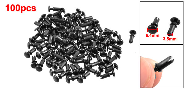 Product Name Push Rivet Part No. R3580 Head Dia.(Approx.) 6.4mm/ 0.25" Head Thickness(Approx.) 1.6mm/ 0.063" Bottom Dia.(Approx.) 3.5mm/ 0.137" Push In Height(Approx.) 8.0mm/ 0.31" Total Height(Approx,) 14mm/ 0.55" Fit for Panel Thickness 5.7-6.6mm Material Nylon Color Black Net Weight 14g Package Content 100±2% Pcs x Push Rivet - Reviews