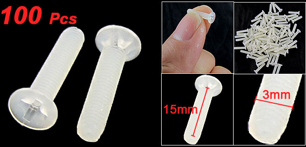 Product Name Screw Type Flat Phillips Head Quantity 100±2% Pcs Thread Length 15mm/ 0.6" Thread Diameter 3mm / 3/25" Overall Size 16 x 5mm/ 0.63" x 0.2" (L*D) Material Plastic Color Off White Net Weight 10g Package Content 100 x Cross Head Screw - Reviews