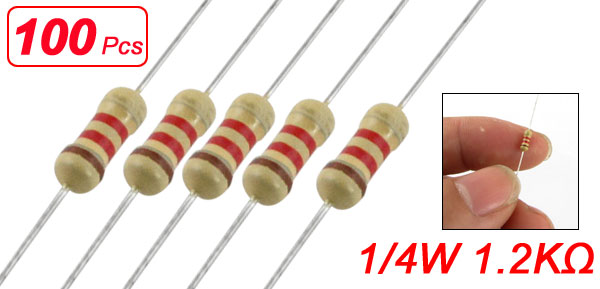Product Name Resistor Resistor Type Carbon Film Rated Power 1/4 W Resistance Value 1.2KΩ Tolerance ± 5% Withstang Voltage 250V Body Size (Approx.) 6 x 2.28mm / 0.23" x 0.089" (L * D) Lead Diameter 0.4mm/ 0.016" Total Length 59mm / 2.3" Color As Picture Shown Weight 10g Package Content 100(±2%) x Carbon Film Resistors - Reviews