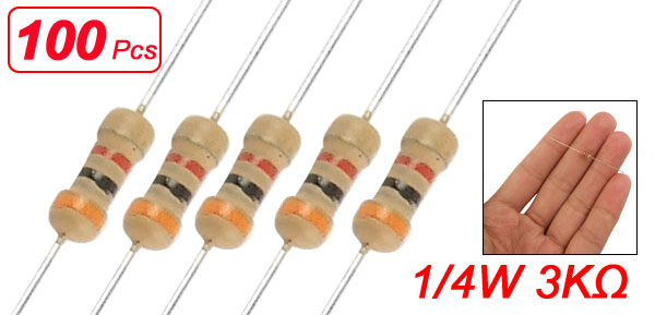 Product Name Resistor Resistor Type Carbon Film Rated Power 1/4 W Resistance Value 3KΩ Tolerance ± 5% Withstang Voltage 250V Body Size (Approx.) 20 x 0.2mm / 0.8" x 0.008"(L*D) Lead Size 5 x 1mm/ 0.196" x 0" (L*Max.D) Total Length 45mm / 1.8" Color As Picture Shown Weight 10g Package Content 100(±2%) x Carbon Film Resistors - Reviews