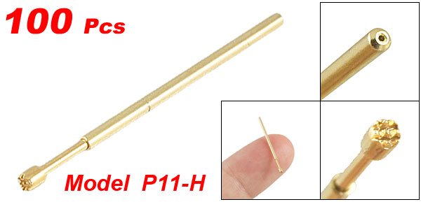Product Name Spring Probes Quantity 100±2% Pcs Model P11-H Material Metal Tip Diameter (Approx) 1.3mm/ 0.051" Barrel Diameter (Approx.) 1.02mm/ 0.04" Overall Length(Each) 24.20mm / 0.953" Color Gold Tone Net Weigth 12g Package Content 100 x Spring Probes - Reviews