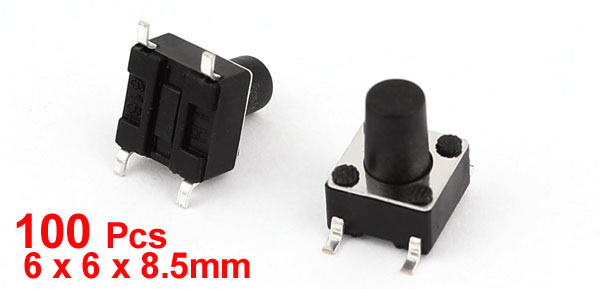 Product Name Tact Switch Action Type Momentary Dimension 6 x 6 x 8.5mm / 0.18" x 0.18" x 0.32"(L*W*H) Button Size 3 x 5mm / 0.12" x 0.2"(D*H) Material Plastic, Metal, Electric Parts Color Black, Silver Tone Net Weight 28g Package Content 100(+/-2%) x Tact Switch - Reviews
