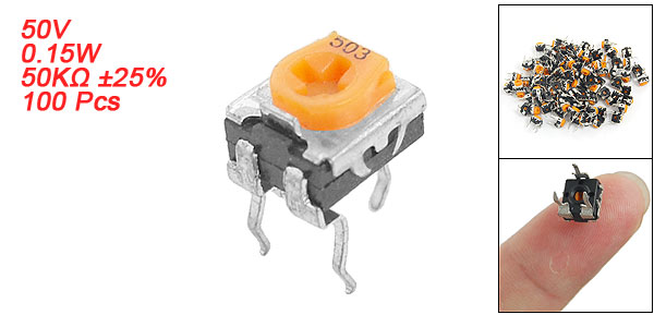 Product Name Variable Resistor Trimmer Potentiometer Max. Operating Voltage 50V Power Rating 0.15W Resistance Value 50K Ohm Resistance Tolerance ±25% Mounting Type Through Hole (DIP) Resistive Material Carbon Film Square Body Size 6.8 x 6.8mm / 0.27" x 0.27" (L*W)