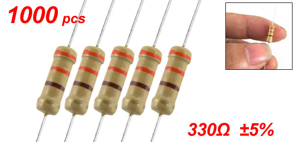 Product Name Carbon Film Resistor Material Type Carbon Film Rated Power 1W Resistance Value 330Ω Tolerance ±5% Body Size (Each One) 10.5 x 3.5mm / 0.41" x 0.138" (L*D) Lead Size (Each End) 23 x 0.3mm / 0.9" x 0.012" (L*D) Total Length (Approx.) 57mm / 2.24" Color As Picture Shown Net Weight 355g Package Content 1000 Pcs (± 2%) x Carbon Film Resistors - Reviews