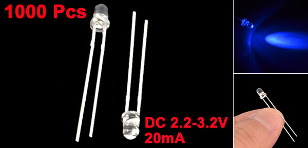 1000 Pcs 2.2-3.2VDC 20mA 2 Pin Terminal 3mm F3 Blue LED Light Emitting Diodes