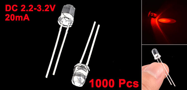1000 Pcs 2.2-3.2VDC 20mA 2 Pin Terminal 5mm F5 Red LED Light Emitting Diodes