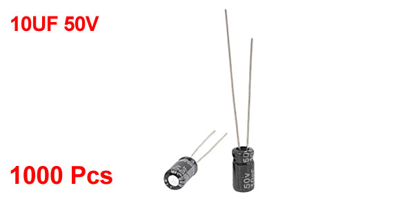Product Name Electrolytic Capacitor Type Radial Lead Maximum Temperature 105°C Withstand Voltage 50V Capacitance 10UF Body Size 7x 4mm / 0.3'' x 0.2'' (L*D) Lead Length 20mm/ 0.8'' 25mm/ 1'' Total Length 33mm/ 1.3" Dielectric Material Aluminum Weight 219g Color Black, Gray Package Content 1000Pcs(± 2%) x Electrolytic Capacitors - Reviews